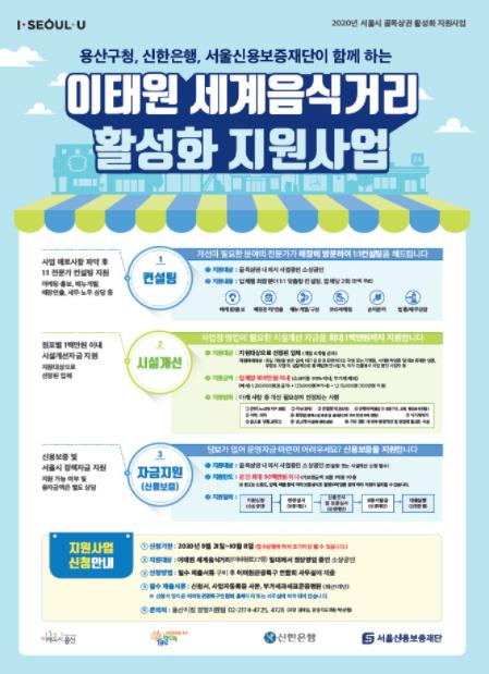지원대상은 세계음식문화거리(이태원로27길) 일대에서 정상영업 중인 소상공인이며 지원내용은 컨설팅(자영업 클리닉)과 시설개선, 자금지원(융자)으로 나뉜다.