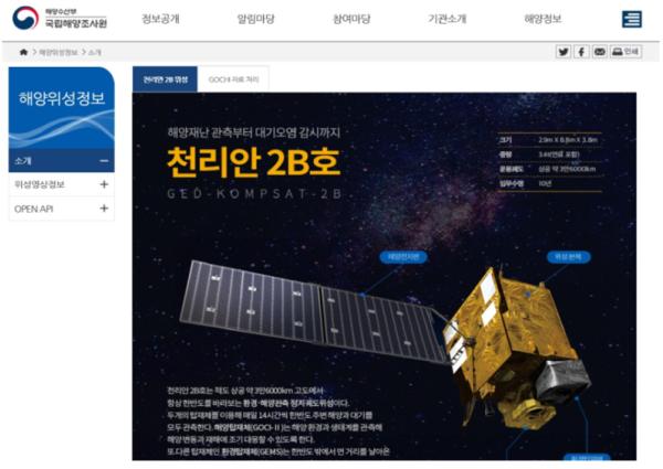 환경부 소속 국립환경과학원, 해양수산부 및 과학기술정보통신부는 10월 5일부터 국립해양조사원 누리집(www.khoa.go.kr)을 통해 천리안위성 2B호의 표준 해양영상정보를 개시한다고 밝혔다.