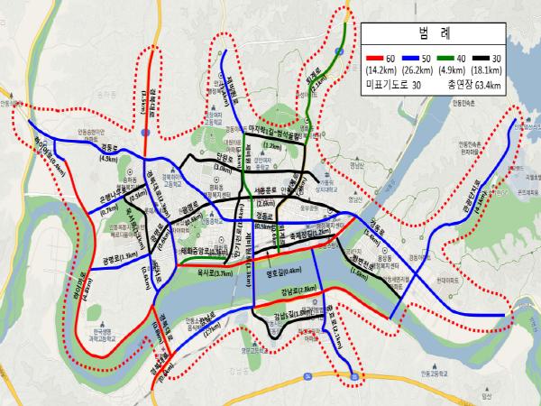 육사로의 경우 이동성이 강조되는 도로로 현행 70km/h에서 50km/h로 하향할 경우 교통정체 등 혼란이 예상되어 60km/h로 완화해 적용하게 되었으며, 사업 추진 경과에 따라 추후 제한속도 추가하향을 검토할 계획이다.