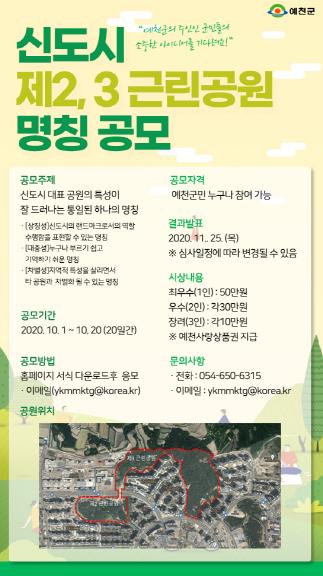 예천군은 10월 1일부터 20일까지 도청 신도시 제2,3근린공원의 통일된 명칭 제정을 위해 전 군민을 대상으로 명칭을 공모한다.