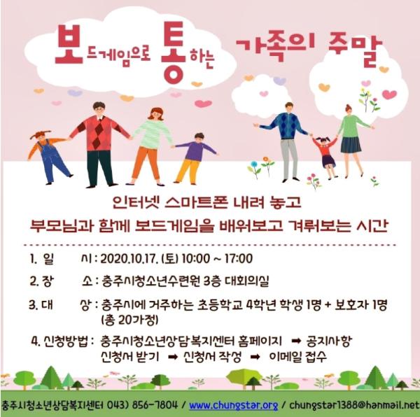 한편, ‘보통(보드게임으로 통하는)가족의 주말 프로그램’은 충주시청소년상담복지센터 홈페이지에서 신청서를 받아 작성한 후 이메일을 통해 접수하면 된다.