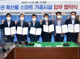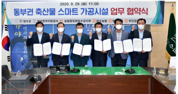 장수군은 29일 장수한우지방공사, 농협중앙회 장수군지부, 장수농협, 장계농협, 무진장축협 등 관계자들이 참석한 가운데 동부권 발전사업으로 추진 중인 장수군 축산물 스마트가공시설 설립과 관련하여 협약식을 체결했다.