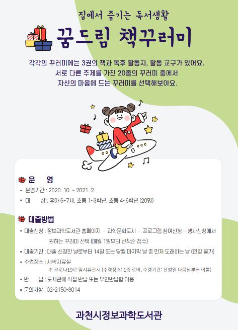 과천시 정보과학도서관은 코로나19가 장기화됨에 따라 10월부터 6개월간 매월 유아 및 초등학생 이용자 20명을 대상으로 비대면 독서 활동 프로그램인 ‘꿈드림 책꾸러미’ 사업을 진행한다고 5일 밝혔다.
