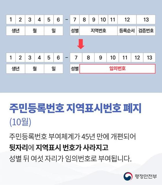 이는 주민등록법 시행규칙의 개정 시행에 따른 것으로, 주민등록번호 체계가 만들어진지 45년 만의 변화다.