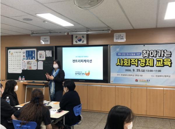 ‘예비 창업 청소년들을 위한 찾아가는 사회적경제 교육’은 사회적경제에 대한 관심도를 제고하여 청소년의 창업 역량을 강화하고 미래지향적인 인재로 성장할 수 있도록 하기 위해 마련됐으며, 지난 8월 인천여자상업고등학교 학생 교육에 이어 인성여자고등학교 2학년 5반 학생을 대상으로 두 번째 교육을 실시했다.