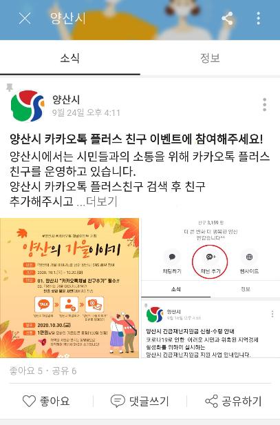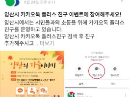 양산시 카카오톡 플러스친구는 시와 양방향 소통을 할 수 있는 채널로 단순 생활민원에 대해 실시간 답변을 받을 수 있다. 시는 내년에 이 채널을 더욱 강화하여 양산시 주요 소식을 받아볼 수 있도록 할 예정이다.