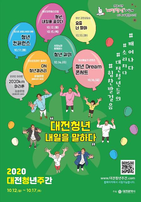 ㅇ 대전청년주간은 지역 청년들에게 소통과 힐링의 장을 제공하는 축제로 올해 행사는 청년 강연 페스티벌, 청년 고민상담소, 청년정책토의, 청년예술가 콘텐츠, 청년 컨퍼런스 등이 온라인으로 진행된다.