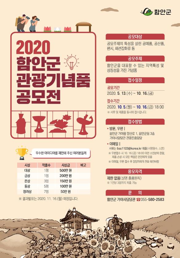 함안군은 창의적이고 우수한 관광기념품을 발굴하고 여행하기 좋은 함안을 알리기 위한 관광마케팅 활용을 위해 2020년도 함안군 관광기념품 공모전을 개최하고 오는 16일까지 제품을 접수받는다.