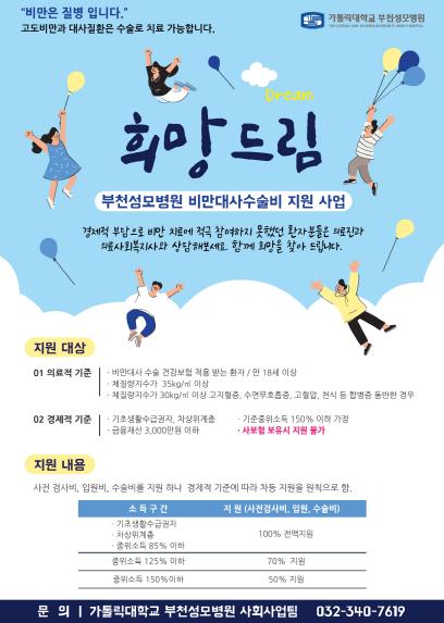 2020 부천성모병원 자선특화 사업인 ‘희망드림’은 경제적 어려움으로 치료에 적극적이지 못 했던 고도비만 환자의 사람의 질 향상과 비만으로 발생한 당뇨병, 고혈압 등 동반 질환 개선을 위해 사전 검사비, 입원비, 수술비를 지원하는 사업이다.