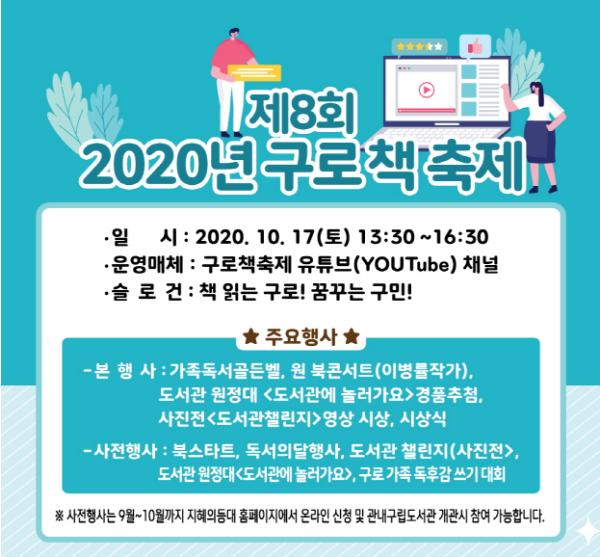 8회째를 맞이한 ‘책 축제’는 독서문화 확산을 위해 2013년 구로구가 시작했다. 올해는 코로나19 확산 방지를 위해 비대면 온라인 축제로 진행한다. 책을 통해 꿈과 희망을 펼쳐 나가길 바라는 의미에서 ‘책 읽는 구로! 꿈꾸는 구민!’을 슬로건으로 정했다.