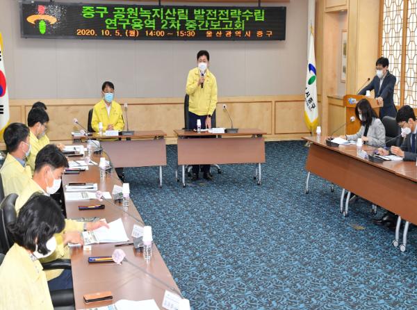 울산 중구는 5일 중구청 2층 중회의실에서 박태완 중구청장과 관계부서장, 자문위원 등 관계자들이 참석한 가운데 공원·녹지·산림 발전전략 수립 연구용역 2차 중간 보고회를 개최했다.