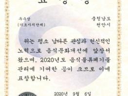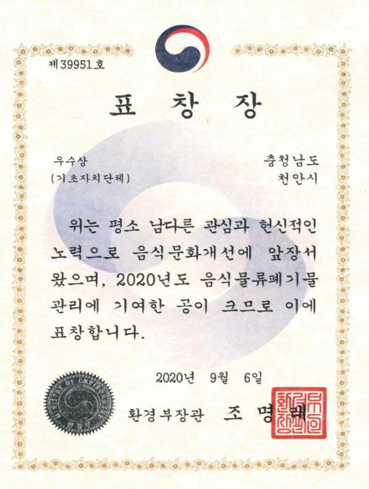 천안시가 전국 기초자치단체를 대상으로 시행된 2020 음식물류 폐기물 관리 성과 평가 결과에서 ‘우수기관’으로 선정돼 ‘환경부 장관 표창’을 받았다.