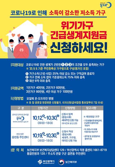 이번 긴급생계지원금은 ▲코로나19로 인한 실직·휴폐업 등으로 소득이 감소(25% 이상)하고 ▲기준중위소득이 75% 이하이면서 ▲재산이 6억 원 이하인 저소득 가구를 대상으로 한다. 단, 기초생활보장(생계급여)·긴급복지(생계지원) 대상자와 타 코로자19 피해지원사업 대상가구(긴급고용안장지원금·소상공인 새희망자금 등), 공무원 및 공공일자리 참여자는 대상에서 제외된다. 전국 55만 가구 가운데 부산지역 대상 가구는 5만여 가구로 총지원금만 245억 원에 달할 것으로 예상된다.