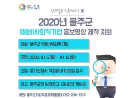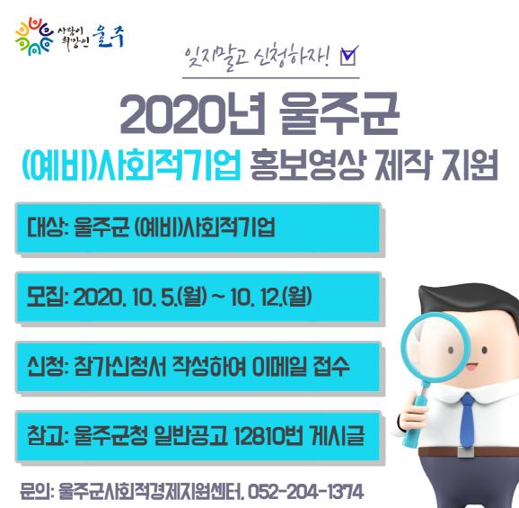 또한 2020년 울주군 (예비)사회적기업 홍보영상 제작 지원사업은 홍보 전담자를 따로 두기 어려운 영세한 사회적경제기업의 상황을 고려해 기업 영상의 컨셉 설정 및 시나리오 작성도 지원된다.