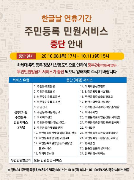 이에 따라 한글날 연휴기간 전후인 오는 8일 오후 5시부터 11일 15시까지 ‘정부24’의 주민등록 등·초본 발급, 주민등록 전입·정정신고 등 총 27종의 민원서비스는 물론 무인민원발급기의 모든 서비스도 중단된다.