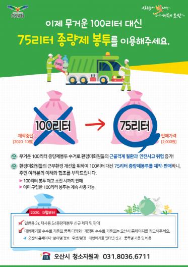 오산시는 환경미화원들의 안전사고 예방을 위해 생활폐기물 종량제봉투의 최대용량을 100리터에서 75리터로 하향조정하고, 100리터 종량제봉투의 제작을 중단한다.