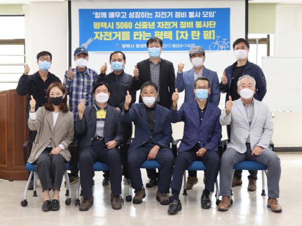 자탄평은 평택시 5060 신중년희망센터 프로그램의 일환으로 ‘자전거 정비사 자격과정’에 참여한 학습자들이 주축이 되어 자발적으로 결성한 봉사 모임으로, 이날 출범을 시작으로 평택시 곳곳에서 자전거를 이용하는 시민을 대상으로 무료 자전거 정비 및 교육 봉사를 실시할 예정이다.