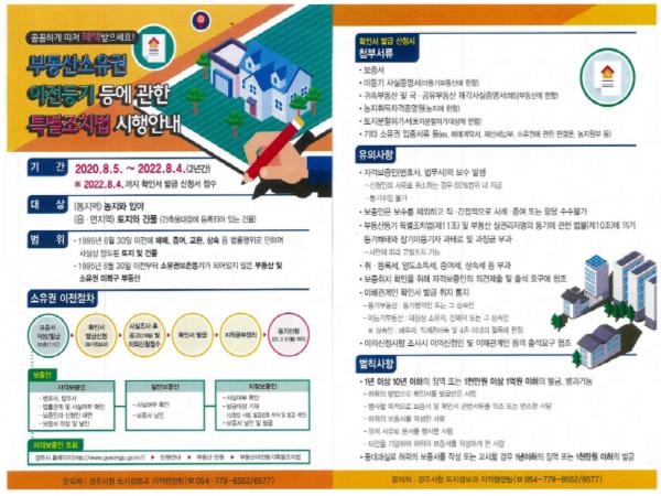 경주시 관계자는 “이전등기 신청 전 적용기준을 꼼꼼하게 따져 실제 권리관계와 등기사항이 달라 불편을 겪었던 시민이 기간 내에 신청해 재산권 행사의 불편을 해소하기를 바란다”고 말했다.