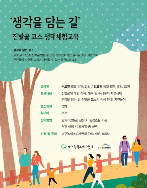 대구시 수성구는 오는 10월 11일부터 범물동 진밭골에서 주민을 대상으로 자연과 함께하는 생태체험교육 프로그램을 운영한다고 밝혔다.