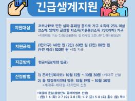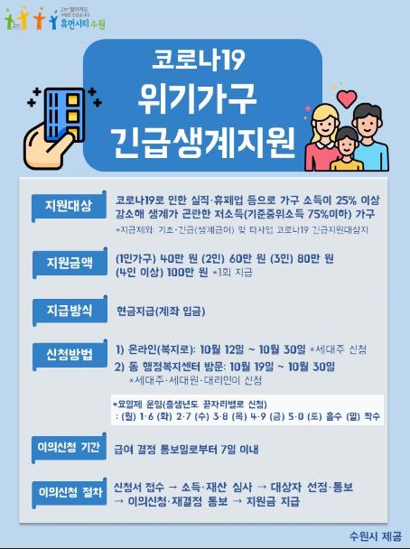 수원시는 기존 복지제도나 코로나19 피해 지원사업의 혜택을 받지 못하는 저소득 위기가구에 지급하는 ‘긴급생계지원금’ 신청·접수가 10월 12일 시작된다고 밝혔다.