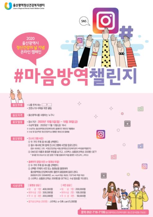 울산시는 울산광역정신건강복지센터가 10월 10일 ‘정신건강의 날’(10월 10일)을 맞아 온라인 홍보활동(캠페인)으로 ‘#마음방역 챌린지’를 추진한다고 밝혔다.