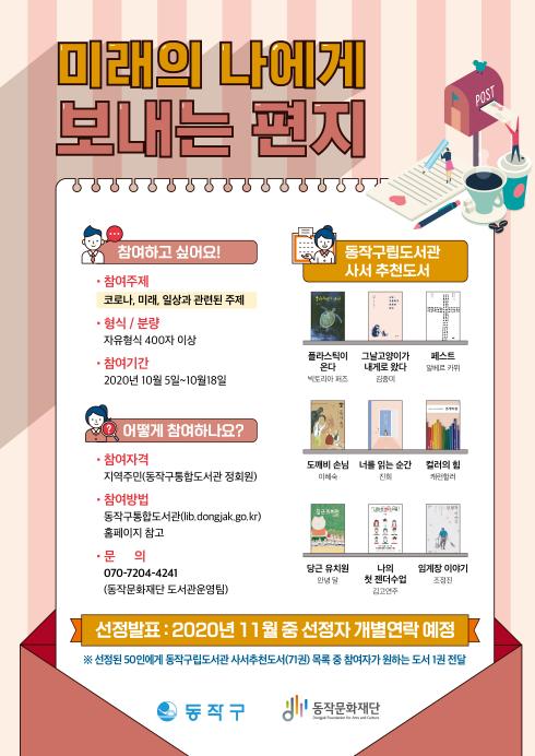 아울러 구는 오는 18일(일)까지 도서관 온라인 프로그램인 「미래의 나에게 보내는 편지」를 진행한다.