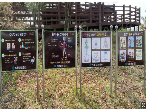 옥천군 관내에는 금연, 절주, 비만, 운동 관련 건강 정보판이 72개소에 94개가 설치되어 있으며, 걷기운동 및 가벼운 등산으로 쉽게 찾아 볼 수 있다.