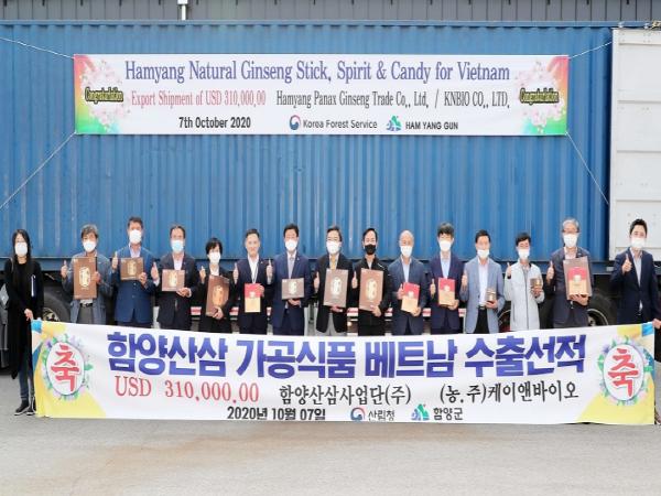이날 수출 선적식에서는 함양산양산삼농축액 골드스틱 라이트 8,200박스, 함양산양산삼농축액 산양산삼정 프리미엄 라이트 3,072박스, 함양산삼캔디 2,700박스 등 40FT 컨테이너 2대 분량으로 미화 31만불 가량을 베트남 하노이의 삼통비나(주)로 선적하였다.