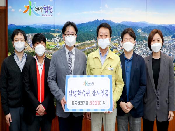 합천군 남명학습관 강사일동은 8일 오전 9시 (사)합천군교육발전위원회를 방문하여 지역 교육발전을 위해 힘써달라며 교육발전기금 2백만원을 전달했다고 밝혔다.