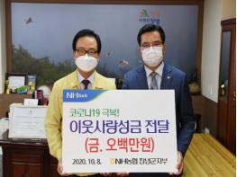창녕군은 8일 NH농협은행 창녕군지부(지부장 김종한)가 군청을 방문해 어려운 이웃에게 전달해달라며 성금 500만원을 기탁했다고 밝혔다.