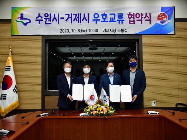 경남 거제시는 8일 오전 거제시청 소통실에서 경기도 수원시와 우호교류를 위한 업무협약을 체결했다.