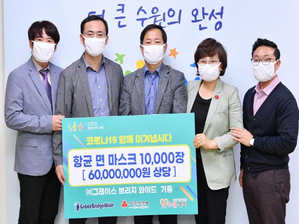 ㈜그레이스브리지와이드가 “코로나19 극복을 위해 사용해 달라”며 수원시에 항균 면 마스크 1만 매(6000만 원 상당)를 기부했다.