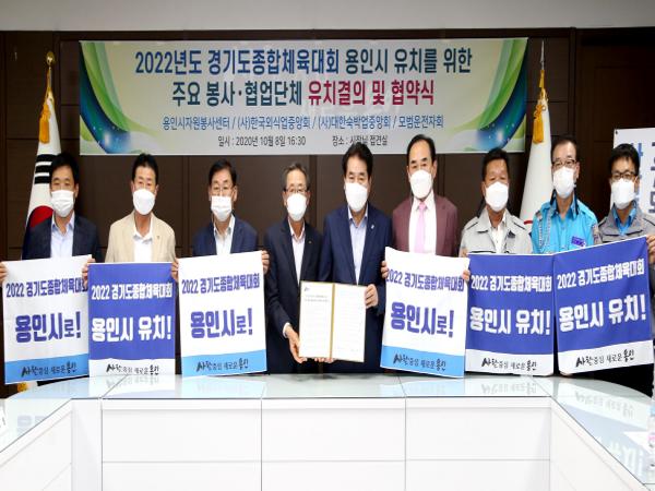 용인시는 8일 시장실에서 경기도 종합체육대회의 성공적 유치를 위해 (재)용인시자원봉사센터, (사)한국외식업중앙회 용인시지부, (사)대한숙박업중앙회 용인시지부, 모범운전자회 등 4개 민간단체와 협약을 맺었다.
