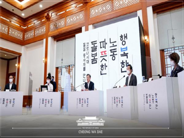 특히, 문재인 대통령은 "돌봄과 같은 대면 서비스는 코로나와 같은 비상상황에서도 공동체를 유지하는 데 없어서는 안 될 필수노동"이라며 "공동체에 꼭 필요한 대면 활동을 하면서 스스로는 위험에 노출될 수밖에 없는 필수노동자는 국가의 특별한 보호를 받아야 한다"고 강조했다.