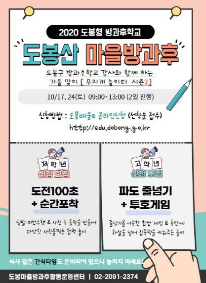 보다 자세한 내용은 도봉구 교육지원과(도봉 마을방과후활동운영센터 ☎ 02-2091-2371~2, 2374~5)로 문의하면 된다.