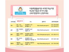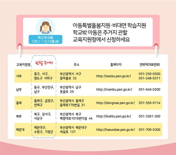 한편, 부산지역 초등 학령기 아동은 ▲재학생 15만3,530여 명, 학교 밖 아동 6,860여 명이고, 중등 학령기 아동은 ▲재학생 73,750여 명, 학교 밖 아동 3,360여 명이다. 이중 학교 밖 아동 10,220여 명이 이번 지원금을 받기 위해서는 보호자가 거주지 관할 교육지원청에 별도 신청해야 한다.