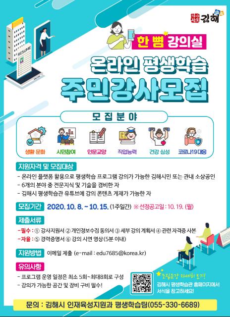 김해시는 코로나19의 장기화되는 상황에서 시민들의 학습권을 보장하기 위해 온라인 평생학습 활성화를 위한 ‘한 뼘 강의실’강사를 모집한다고 밝혔다.