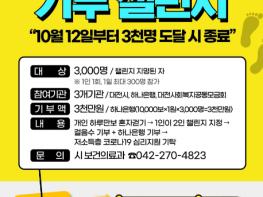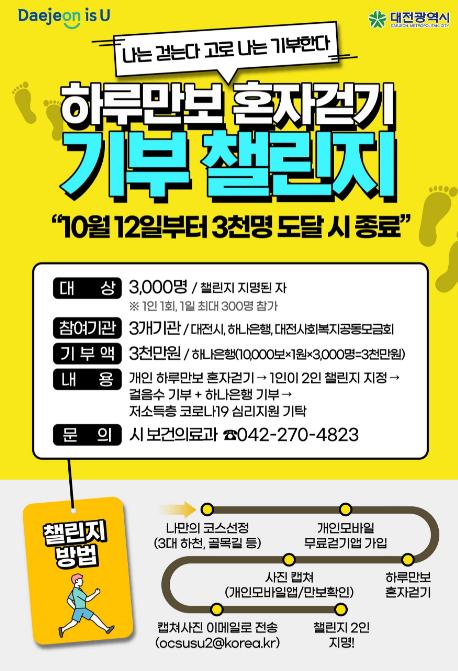 12일 대전시에 따르면 ‘하루만보 혼자걷기 기부 챌린지’는 대전시와 하나은행 충청영업그룹, 대전사회복지공동모금회 3개 기관 협력 사업으로 추진된다.