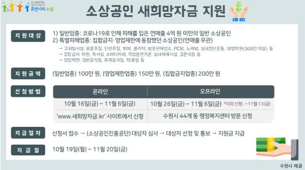 감염병 확산 예방을 위해 정부의 집합금지명령과 영업 제한에 동참했던 수원시 내 소상공인은 물론 올해 매출이 감소한 연 4억 원 미만의 일반 소상공인이 100만~200만 원의 긴급재난지원금을 받을 수 있다.