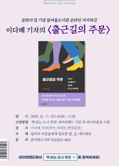 부천시 꿈여울도서관은 10월 문화의 달을 맞이하여 이다혜 씨네21 기자를 초청하여 ‘일터의 여성에게 필요한 말, 글, 네트워킹’이라는 주제로 온라인 저자특강을 개최한다.