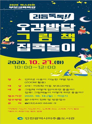 인천광역시 미추홀도서관이 오는 27일 북스타트 부모교육 특강“리듬톡톡!! 오감발달 그림책 집콕놀이”프로그램 비대면으로 진행한다고 밝혔다.