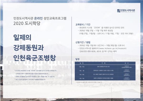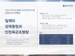 2020년 ‘도시학당’은 <일제의 강제동원과 인천육군조병창> 이라는 주제로 10월 27일부터 11월 17일까지 매주 화요일마다 진행되며, 코로나19의 확산 방지를 위해 온라인 화상회의 시스템 ‘ZOOM’을 통해 비대면으로 실시간 진행된다.