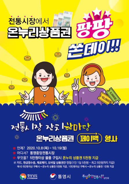 통영시는 오는 10월 30일까지 코로나19 피해회복을 위한 전통시장 소비촉진 행사인 「온누리상품권 페이백 이벤트」2차를 실시한다.