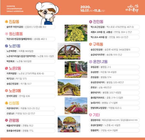 오는 17일부터 11월 8일까지 23일간 계속되는 유성구국화전시회는 예년과 달리 관람객들의 집합을 분산하기 위해 유성구 관내 30개소에 나눠 열린다.