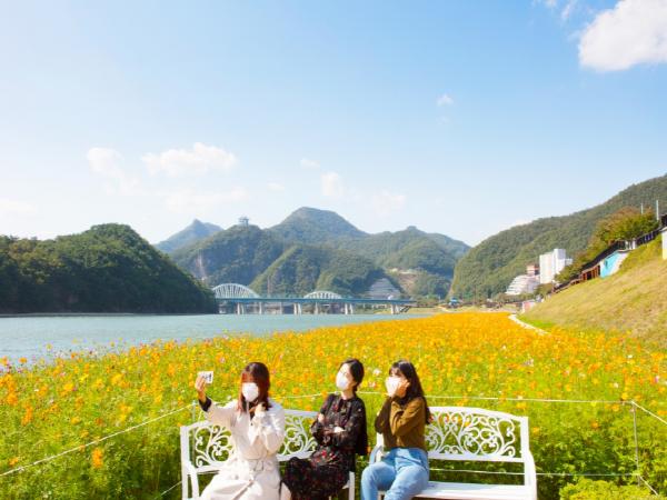 단양 강변의 코스모스 꽃길은 분홍빛과 보랏빛의 일반 코스모스와 함께 강렬한 노란빛을 띠는 황화 코스모스로 이뤄져 다른 곳의 코스모스 꽃길과는 차별화된 아름다움을 더하고 있다.