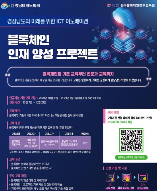 교육은 인공지능 분야 실무형 전문인재 180명과 블록체인 분야 실무형 전문인재 70명 양성을 목표로 경남테크노파크 정보산업진흥본부와 도내 4개 대학(경상대, 창원대, 인제대, 창원문성대)에서 진행된다. 인공지능·블록체인 2개 분야 전 과정이 무료로 운영된다.