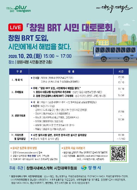 창원시는 간선급행버스체계(BRT) 사업에 대한 시민 대토론회가 오는 20일 시청 시민홀에서 개최된다고 12일 밝혔다.