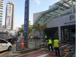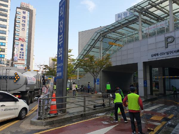의정부시시설관리공단은 12일 오전 9시부터 상가관리부와 희망회복종합지원센터(센터장 김충식)의 협업으로 의정부역 서부광장 일대를 살수차와 인력을 동원하여 물청소 및 소독을 실시하였다.