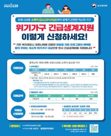 긴급생계지원금 대상자는 코로나19로 인해 가구 소득이 25% 이상 감소하고, 가구원 전체소득의 합이 기준 중위소득 75% 이하이며, 대도시 기준 재산이 6억 원 이하인 가구다.