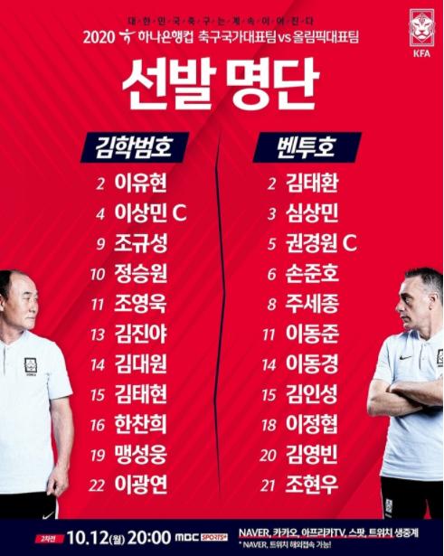 파울루 벤투 감독이 이끄는 남자 국가대표팀과 김학범 감독이 이끄는 남자 올림픽대표팀이 2020 하나은행컵 축구국가대표팀 vs 올림픽대표팀 2차전에 나설 선발 명단을 발표했다.